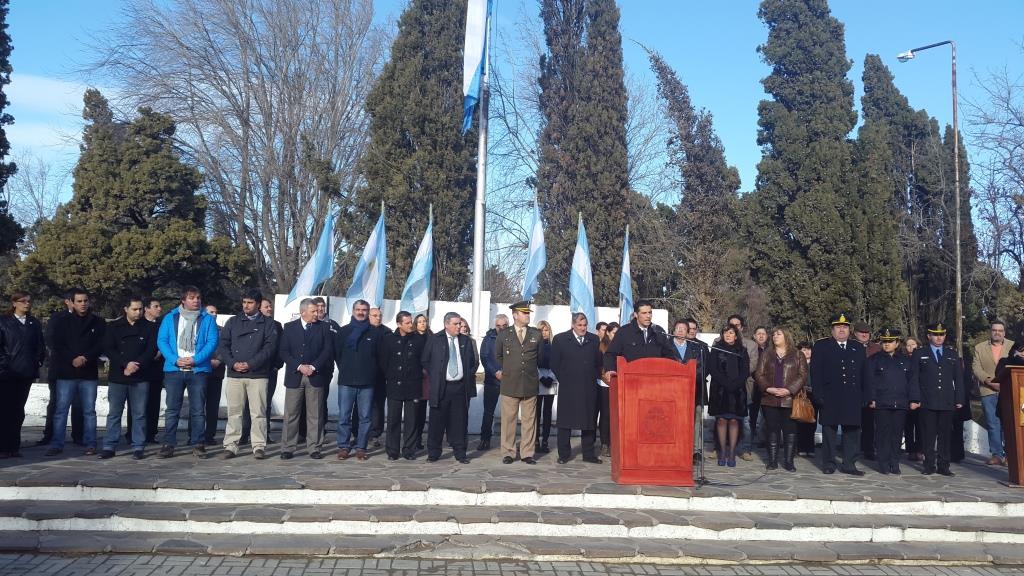 El acto protocolar comenzó con el izamiento del pabellón nacional en la plaza céntrica de la ciudad y el ingreso de las banderas de ceremonia. Los presentes entonaron el Himno Nacional Argentino y la Marcha de las Malvinas, acompañados por la banda militar «Combate de San Carlos» del Regimiento asentado en esa localidad.