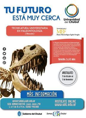 La Universidad del Chubut (UDC) y el Museo Paleontológico Egidio Feruglio (MEF) abrieron hoy la preinscripción para la Tecnicatura en Paleontología, inédita a nivel mundial, que contará no solo con estudiantes nacionales sino también con un cupo de alumnos de otros países que podrán estudiar a través de la metodología bimodal que ofrece la casa de estudios.