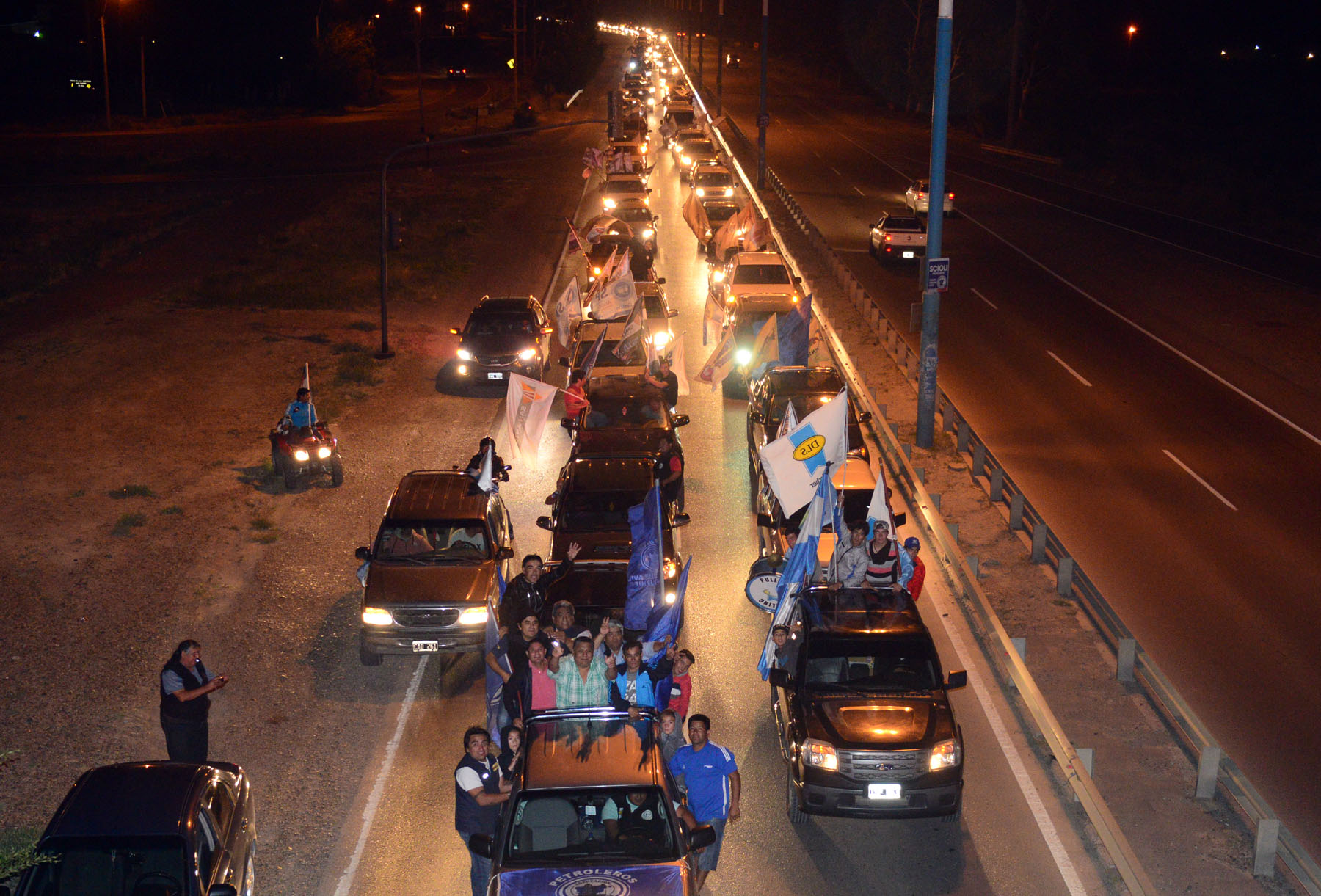 Este martes 2 de febrero por la noche y tras la ronda de negociaciones que permitieron concretar un acuerdo para mantener los puestos en el sector hidrocarburífero, una multitudinaria caravana esperó a Jorge Ávila en el al aeropuerto y fue acompañando hasta las calles céntricas de la ciudad donde el dirigente brindó un discurso.
