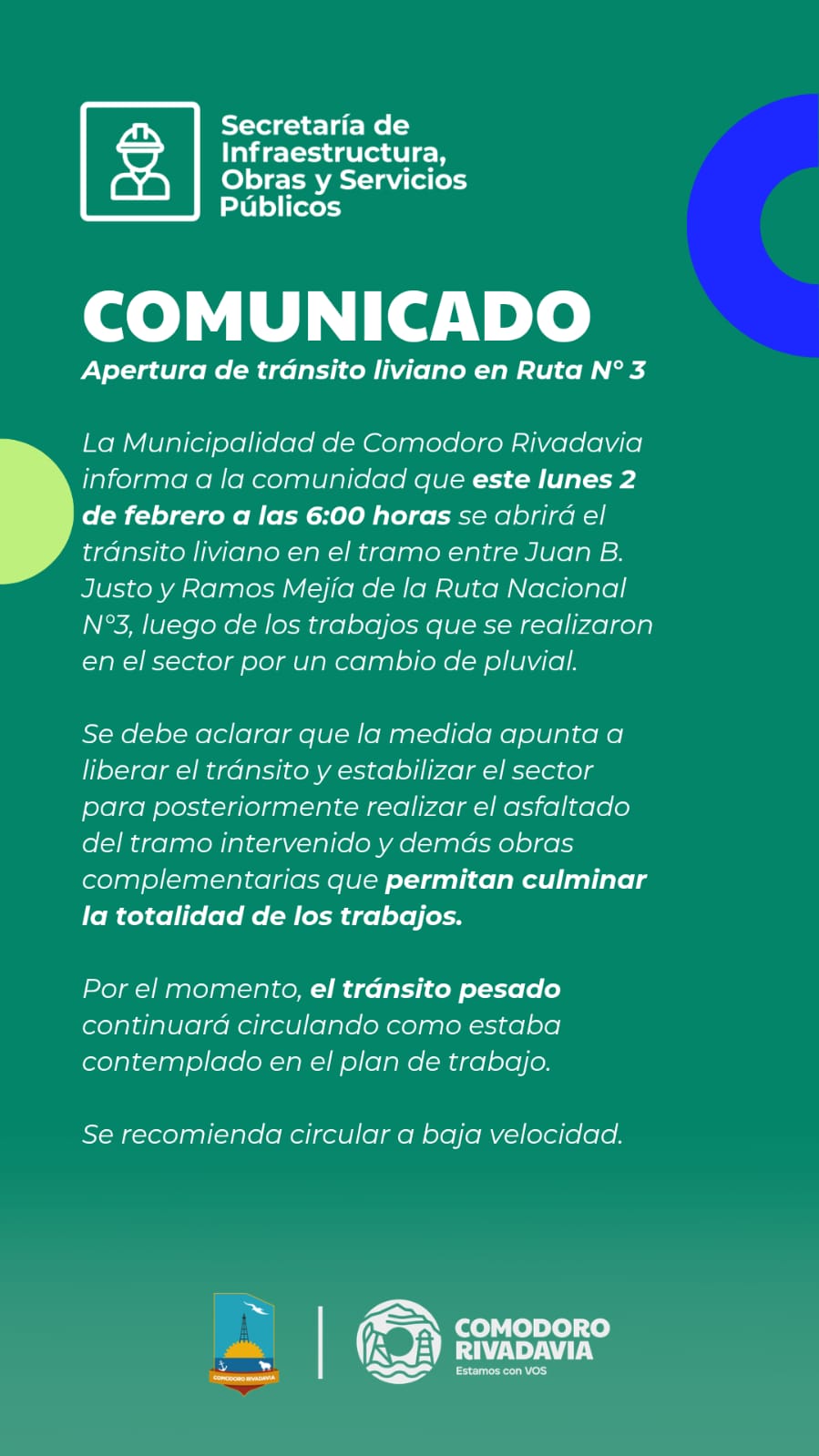 La Municipalidad de Comodoro Rivadavia informa a la comunidad, que este lunes 2 de febrero a las 6:00 horas, se abrirá el tránsito liviano en el tramo comprendido entre Juan B. Justo y Ramos Mejía de la Ruta Nacional N°3, luego de los trabajos que se realizaron en el sector por un cambio de pluvial.