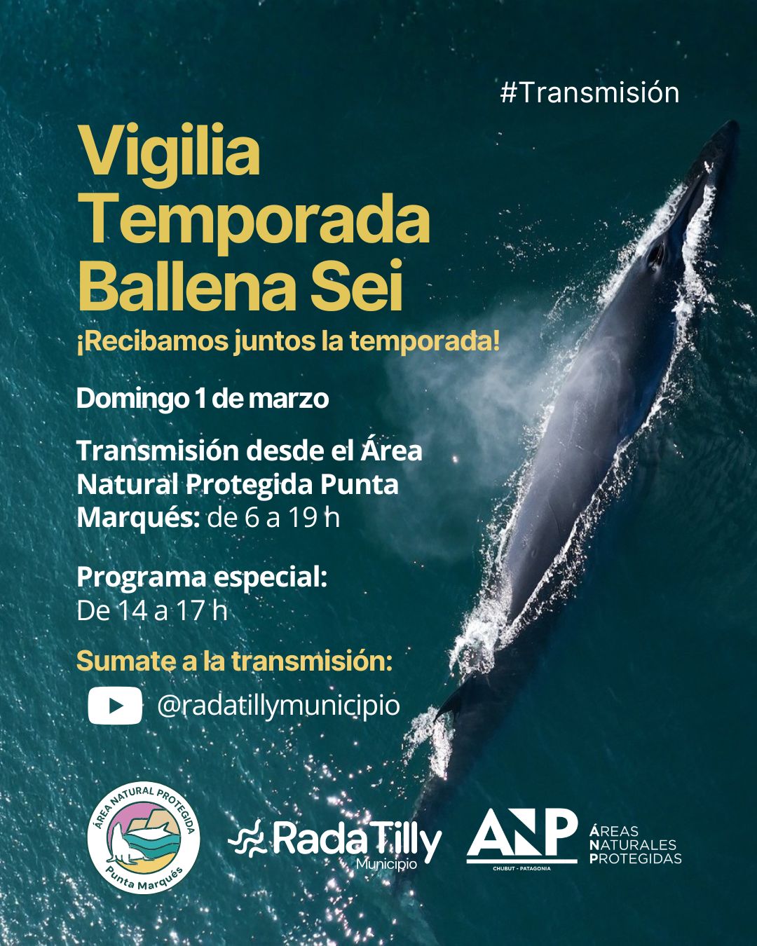 Rada Tilly inicia la Temporada 2026 de Avistaje de Ballena Sei con una vigilia en Punta Marqués y transmisión en vivo