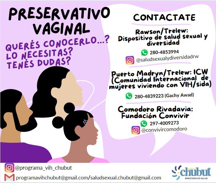 Además, el Ministerio de Salud provincial informó que las personas interesadas pueden acceder al preservativo vaginal contactarse con las siguientes instituciones: el Dispositivo de Salud Sexual y Diversidad del Hospital Subzonal de Rawson (teléfono 280-4853994, IG @saludsexualydiversidadrw); la Comunidad Internacional de Mujeres Viviendo con VIH/SIDA (ICW) en Puerto Madryn (teléfono 280-4839223, Gachy Awad); y la Fundación Convivir de Comodoro Rivadavia (teléfono 297-4009273).
