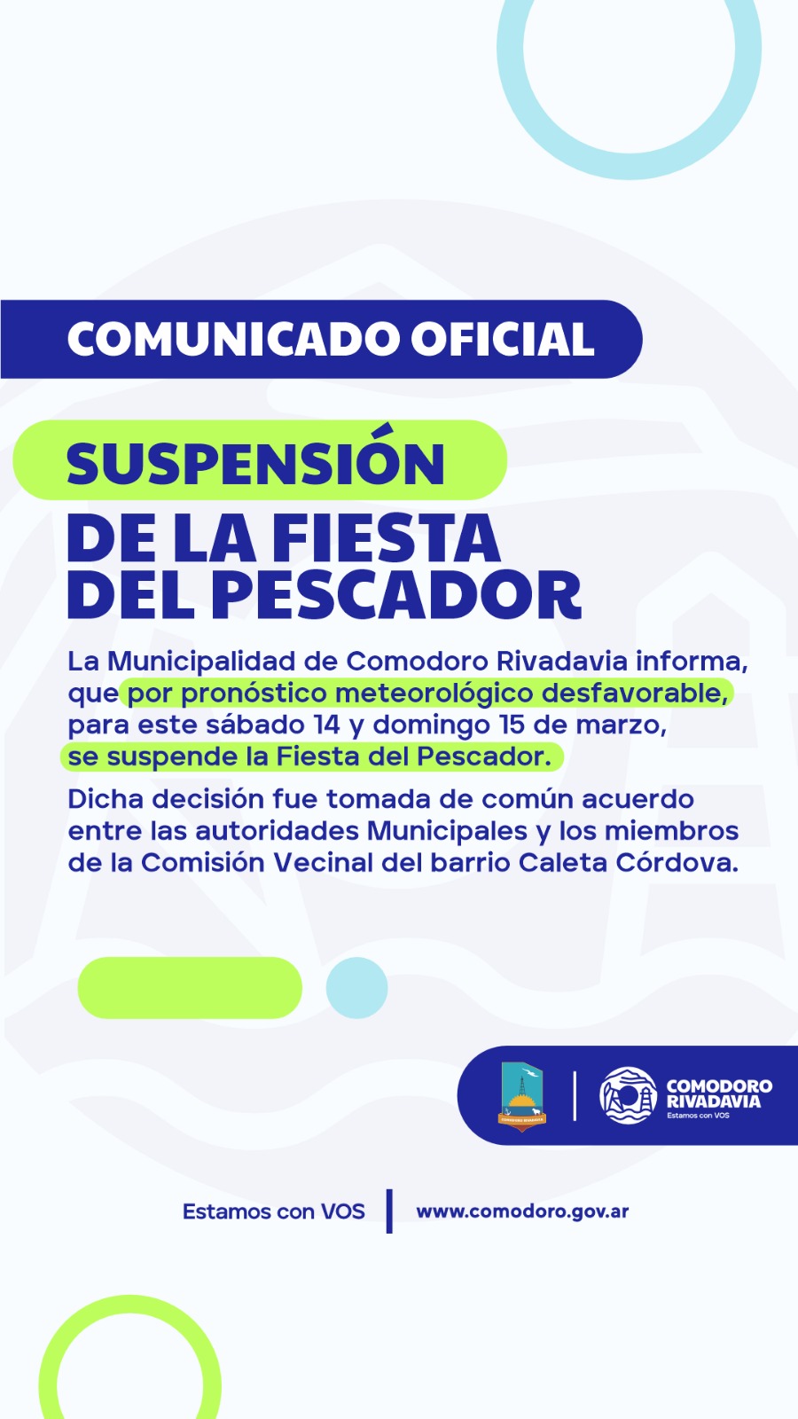 La Municipalidad de Comodoro Rivadavia informa, que por pronóstico meteorológico desfavorable, para este sábado 14 y domingo 15 de marzo, se suspende la Fiesta del Pescador.