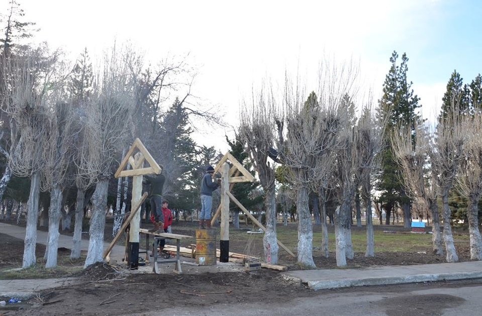 Personal municipal de Alto Río Senguer está realizando importantes reformas y refacciones en la plaza General San Martín Alto Río Senguer, tales como el arreglo de las veredas, la parquización que incluye siembra de césped, canteros, pórticos de acceso en cada entrada, bancos y luminaria totalmente nueva.