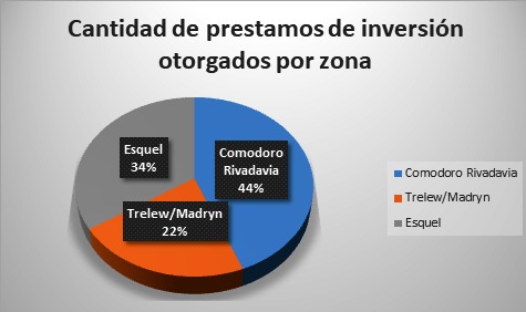 Con la línea de préstamos para inversión el Banco asistió a 82 PyMES de distintos lugares de la provincia. El 55% de las empresas asistidas pertenece a la zona de Comodoro Rivadavia; el 31% a la zona del Valle y el 14% a la regional de Esquel.