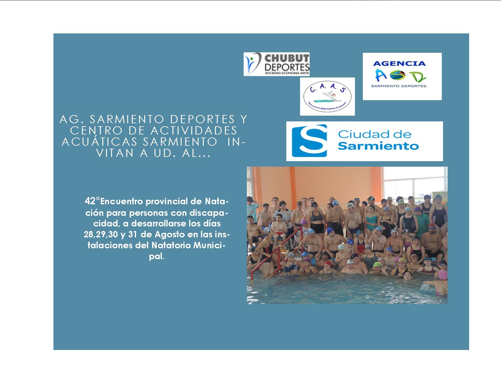 Ya se están ultimando los detalles para recibir el 42° Encuentro Interprovincial de Natación De Discapacidad que se llevará a cabo desde el 28 al 30 de Agosto en el Centro de Actividades Acuáticas de Sarmiento.
