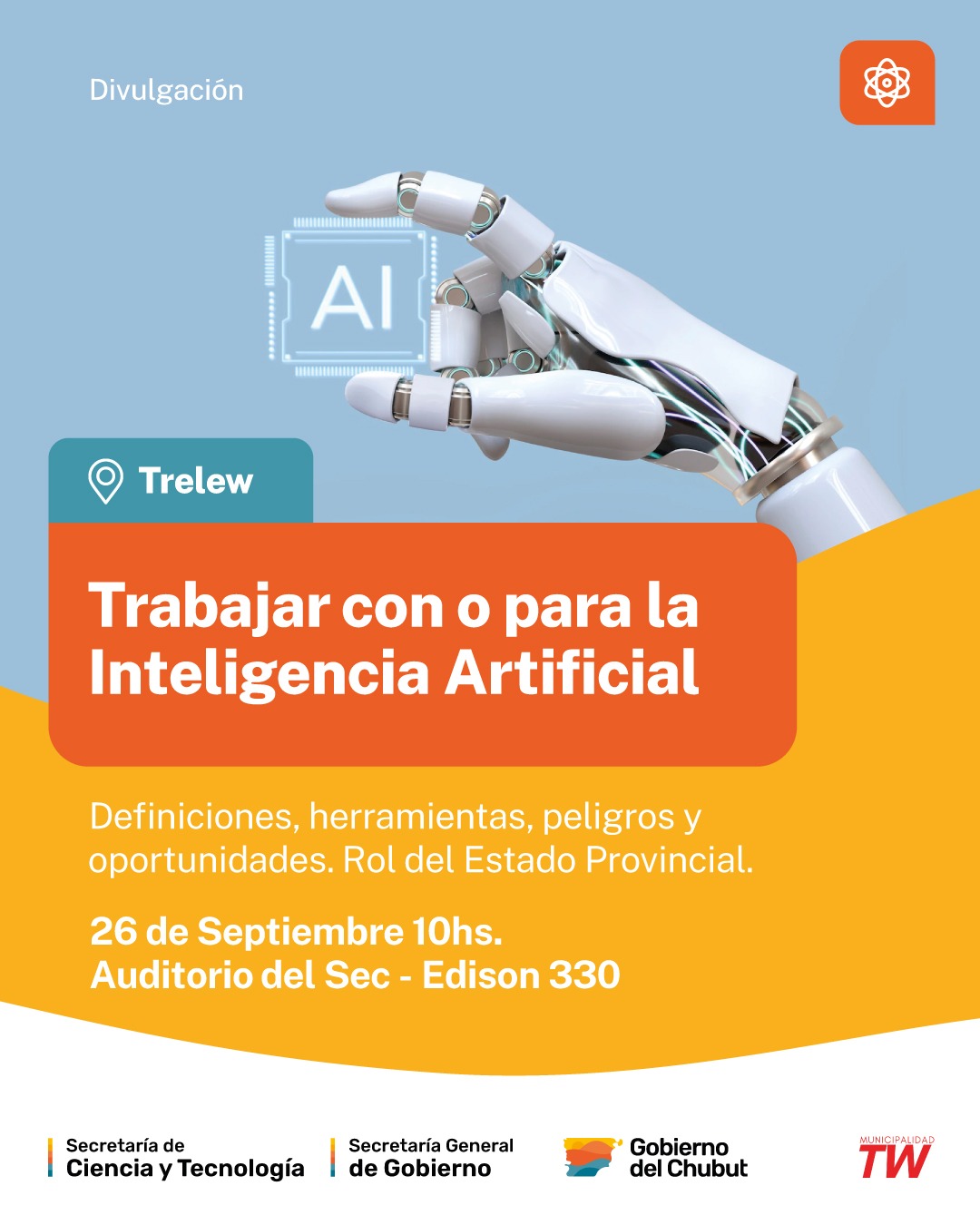 La iniciativa bajo el nombre seminario-conversatorio “Trabajar con o para la Inteligencia Artificial: Definiciones, herramientas, peligros y oportunidades” es llevada adelante por la Secretaría de Ciencia y Tecnología del Chubut, y organizada en colaboración con la Subsecretaría de Innovación y Mejora de Procesos y la Municipalidad de Trelew.