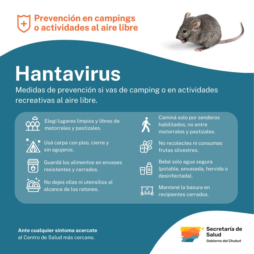 El Gobierno del Chubut, a través de la Secretaría de Salud provincial, recuerda a la comunidad una serie de medidas de cuidado que es importante tener en cuenta para prevenir la infección por Hantavirus, ya que durante la temporada de verano aumentan las actividades al aire libre y las tareas frutihortícolas en la zona cordillerana.