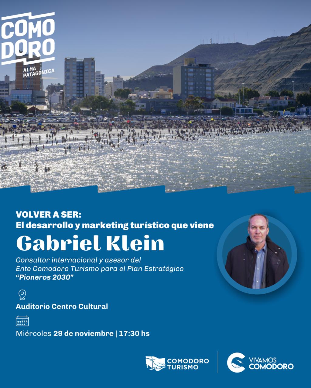 Bajo la organización del Ente Comodoro Turismo, este miércoles se tendrá lugar la jornada “Volver a ser”, a cargo del reconocido consultor Gabriel Klein, donde se presentarán las nuevas tendencias en materia turística. El evento, destinado a emprendedores, prestadores turísticos, estudiantes universitarios y público en general, se desarrollará desde las 17:30 horas, en el Centro Cultural, con entrada libre y gratuita, previa inscripción en el link https://forms.gle/i7QXrsdxXZpDiCFY6.