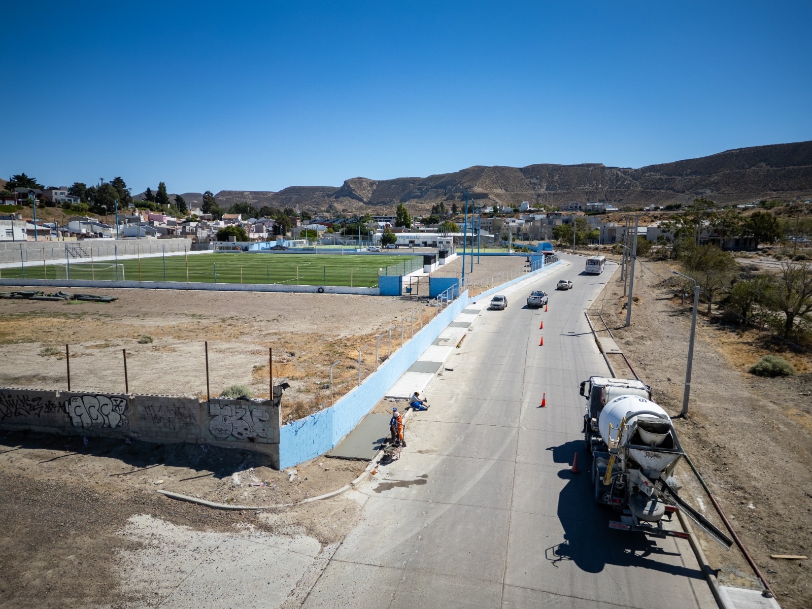 La obra contempla la ejecución de veredas en ambos márgenes de la avenida. En el frente a la cancha, se interviene en una superficie aproximada de 382,8 metros cuadrados. En tanto, del lado de la cancha se ejecutan alrededor de 500 metros cuadrados de vereda. En este sector, la superficie es mayor debido a que la vereda cuenta con un ancho aproximado de 2,5 metros en gran parte de su extensión.
