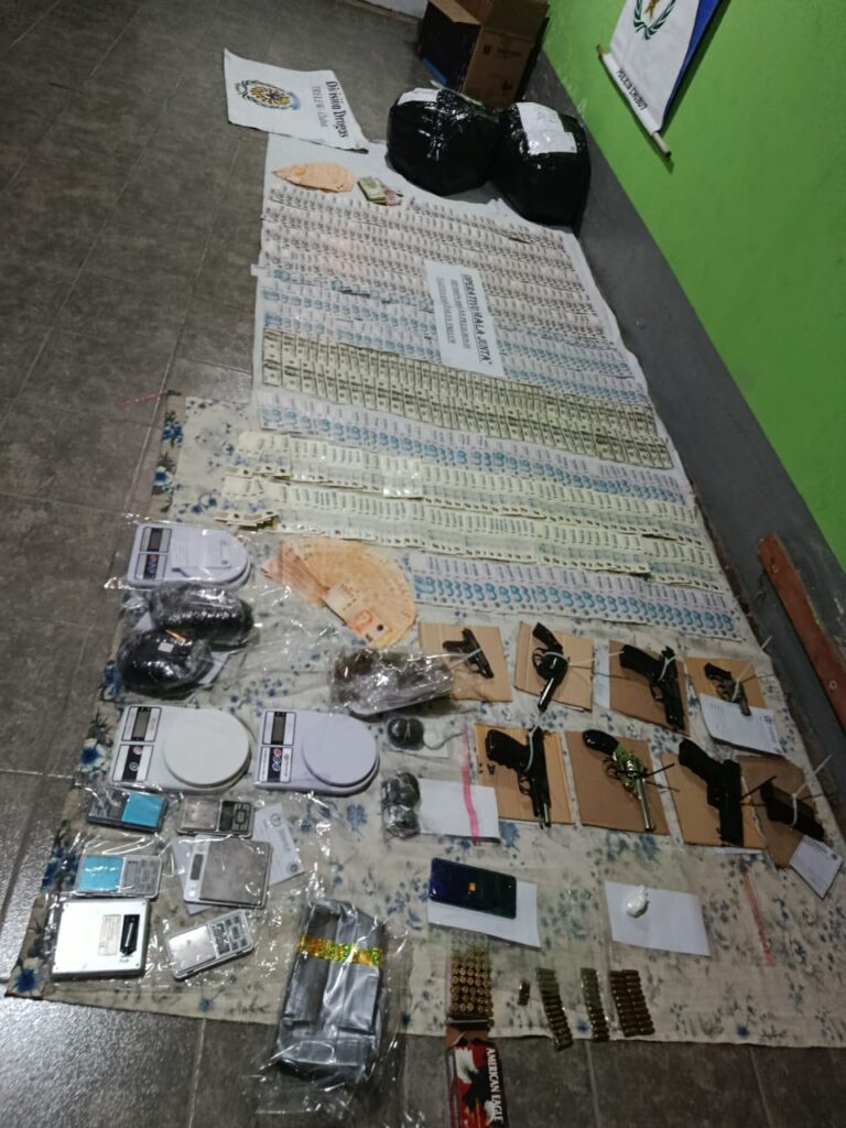 Hay 8 detenidos, se secuestraron 15 kilos de marihuana, también cocaína y 10 balanzas de precisión, además de 13 armas de fuego y 50 celulares. Se incautaron más de 6 millones de pesos, 6.700 dólares y dos vehículos. Hubo 19 allanamientos y participaron 200 efectivos.