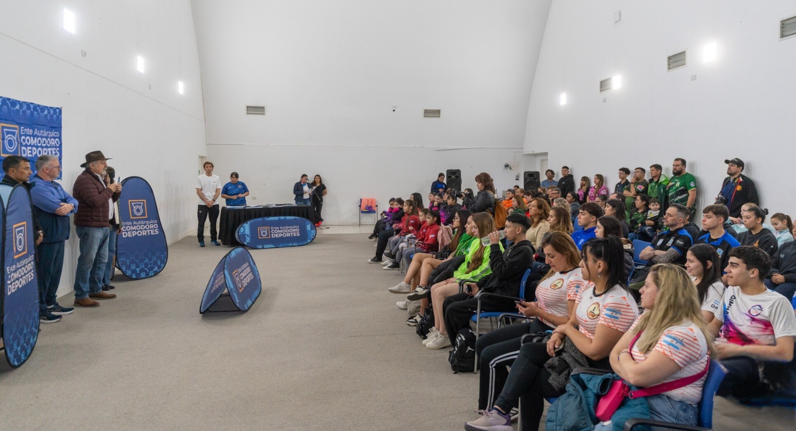 El acto tuvo lugar este jueves, en el Centro de Información Pública, con la presencia del intendente Othar Macharashvili; el presidente del Ente Comodoro Deportes, Hernán Martínez; la secretaria de Género, María Cativa; y el titular de la cartera de Control Urbano y Operativo, Miguel Gómez; además de dirigentes, entrenadores, deportistas y familiares.