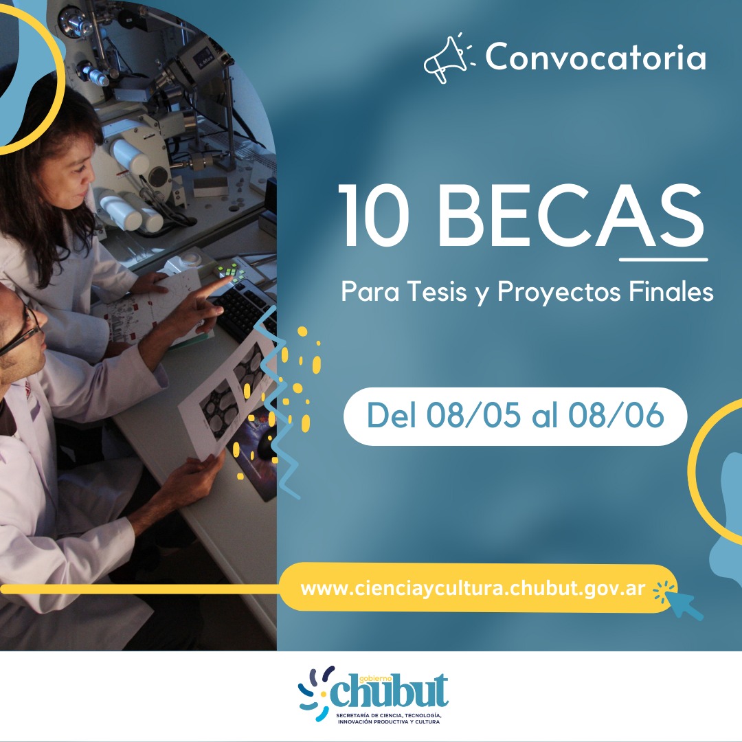La Secretaría de Ciencia, Tecnología, Innovación Productiva y Cultura del Chubut informa que desde hoy y hasta el 8 de junio estará abierta la inscripción para el Programa de Apoyo Económico para Tesis y Proyectos Finales destinado a estudiantes de grado de nuestra provincia.