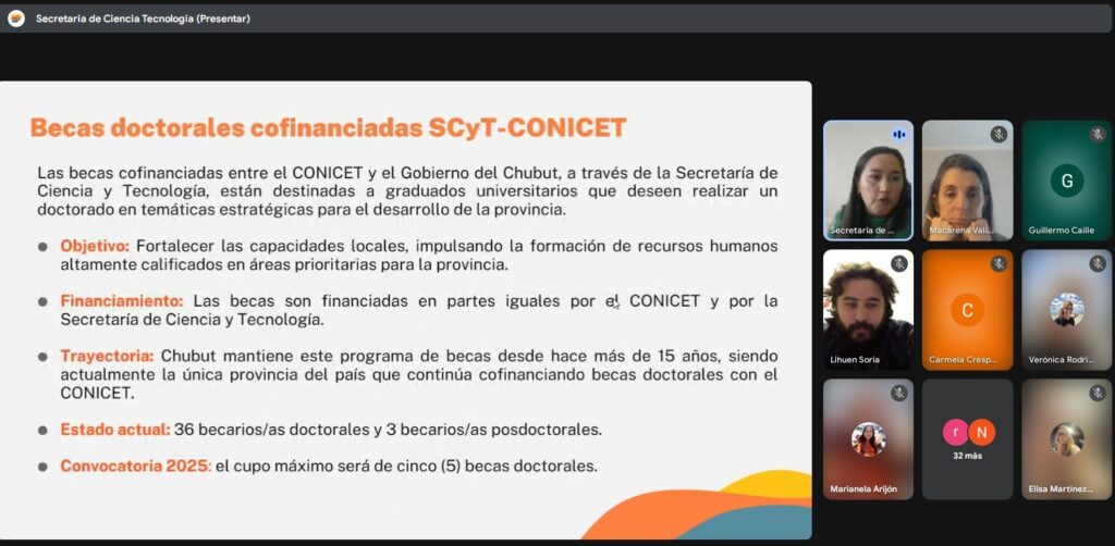 El Gobierno del Chubut que conduce Ignacio “Nacho” Torres, a través de la Secretaría de Ciencia y Tecnología organizó dos charlas informativas sobre la convocatoria 2025 de Becas Doctorales Cofinanciadas.