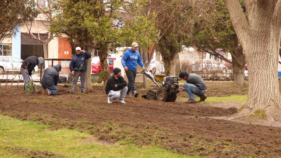 En la ciudad de Sarmiento, personal de la Dirección de Medio Ambiente, dependiente de la Secretaría de Infraestructura, Servicios Públicos y Planificación Urbana, comenzó con los trabajos de movimiento de suelo para el resembrado de césped y posterior forestación de la plaza central de la localidad.