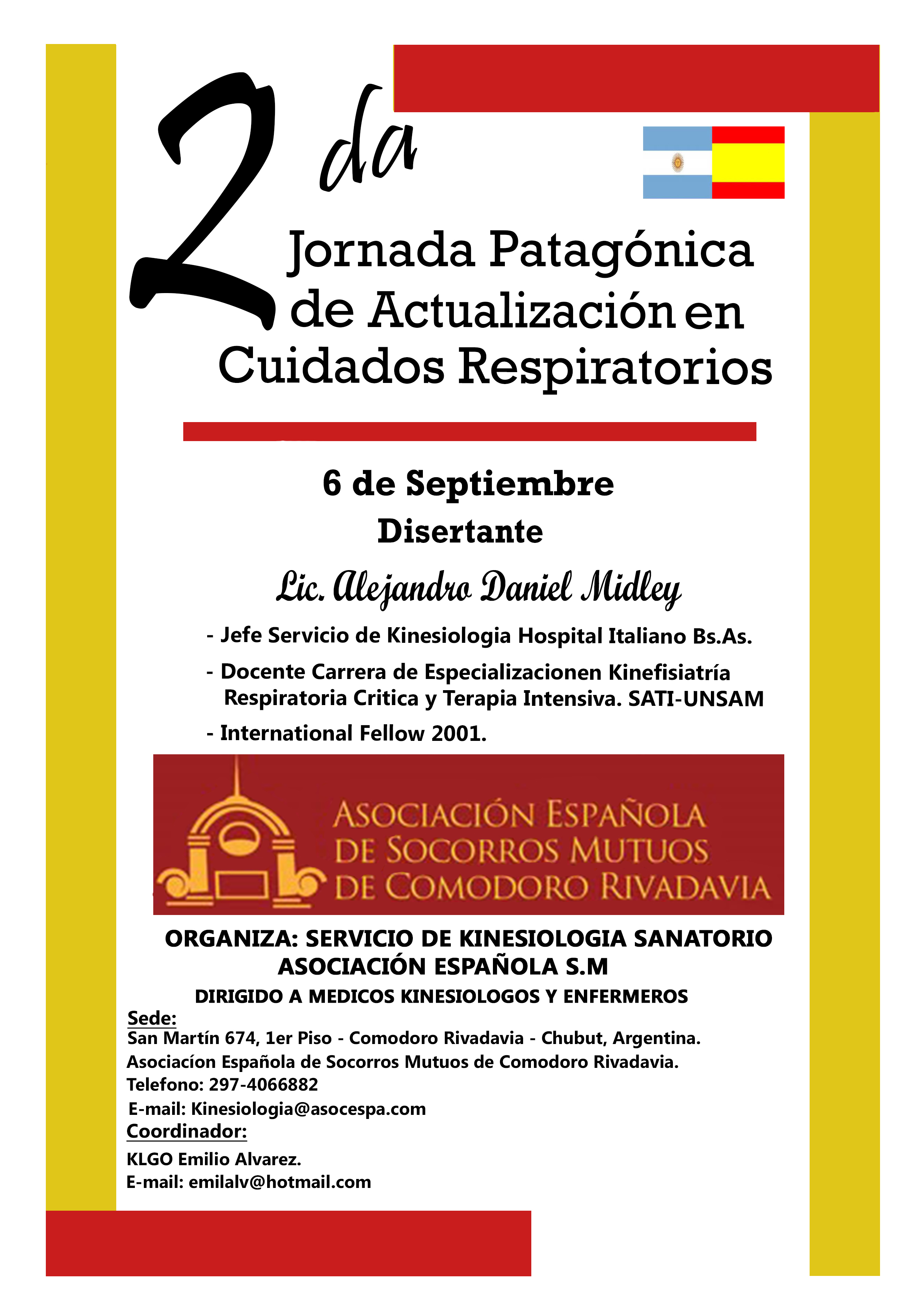 Con el objetivo de darle continuidad a la formación académica de los profesionales que integran el staff médico del Sanatorio de la Asociación Española de Socorros Mutuos, se llevaran a cabo – el próximo 06 de septiembre – las Segundas Jornadas Patagónicas de Actualización en Cuidados Respiratorios las cuales se hacen extensivas a todos los profesionales médicos, kinesiólogos y enfermeros de la región.