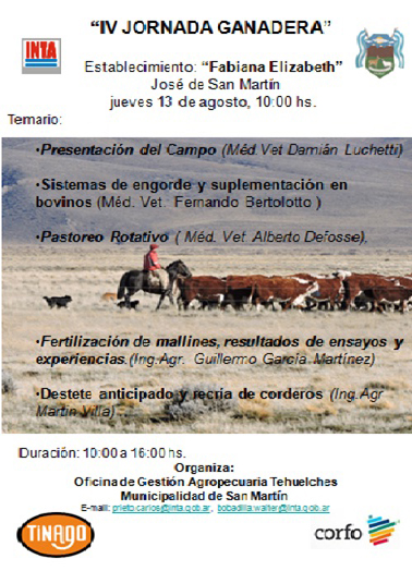 La regional Sur de CORFO, junto a INTA, invita a la IV Jornada Ganadera a realizarse el jueves 13 de agosto a partir de las 10 horas en el establecimiento Fabiana Elizabeth de José de San Martín, con el objetivo de potenciar la producción ganadera local, a cargo de los disertantes Damián Lucchetti, Alberto Defosse, Fernando Bertolotto, Guillermo García Martínez y Martin Villa de INTA.